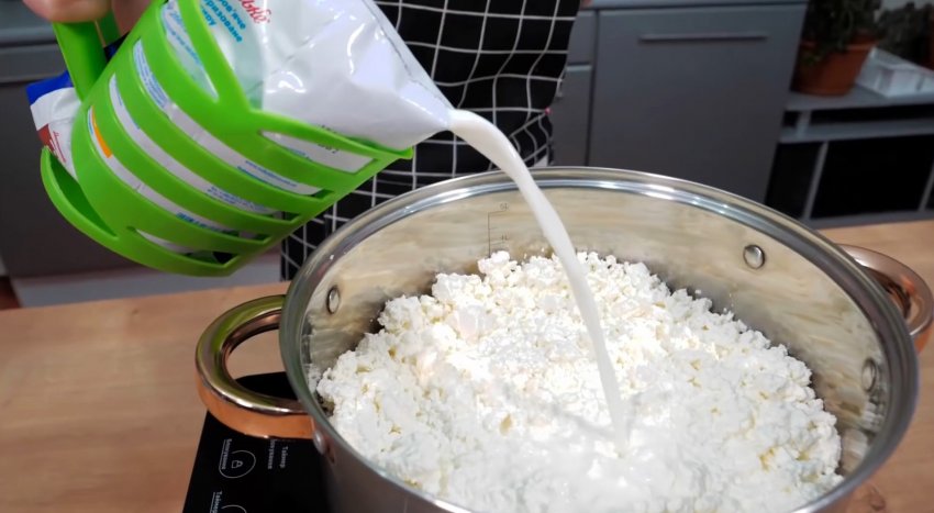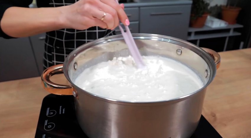 Масса перемешивается и варится на слабом огне до отделения сыворотки, на что уйдет 15-20 мин.