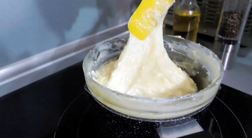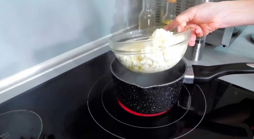 Дальше каждая часть готовится поочередно. В кастрюле нужно вскипятить воду, и поставить сверху миску с творогом. Нужна водяная баня, то есть, чтобы дно не касалось воды. На плите ставится средний огонь, и масса постоянно помешивается. Нужно ее расплавить до однородной массы без комков.
