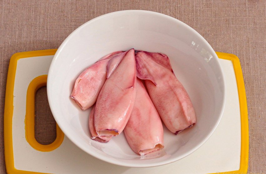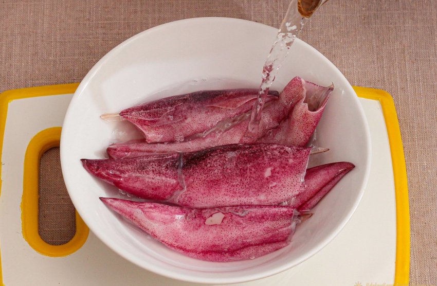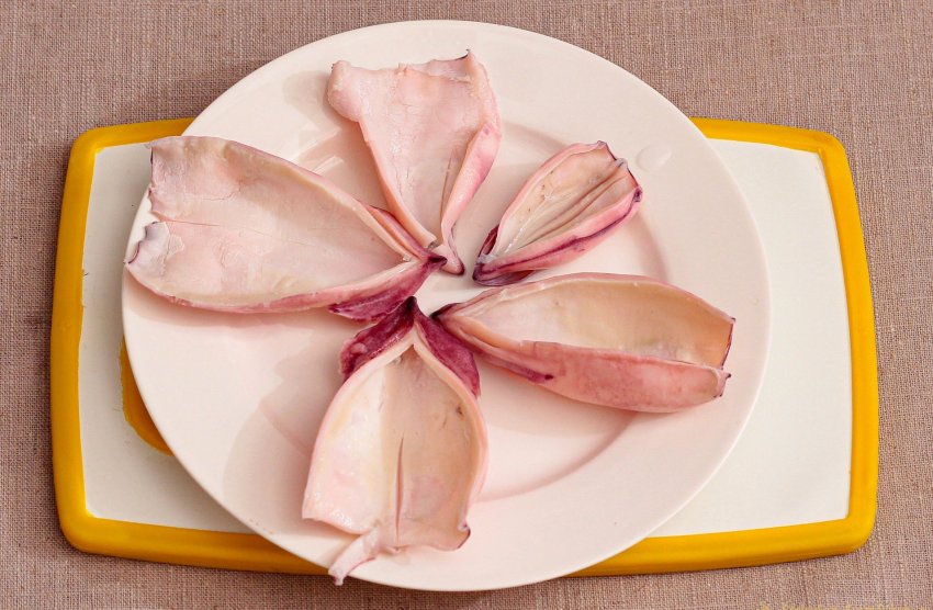 После варки очищаем тушки от остатков внутренностей. Делаем с одной стороны продольный разрез, разворачиваем. Ножом аккуратно скоблим внутреннюю часть и промываем очищенных кальмаров под холодной водой.