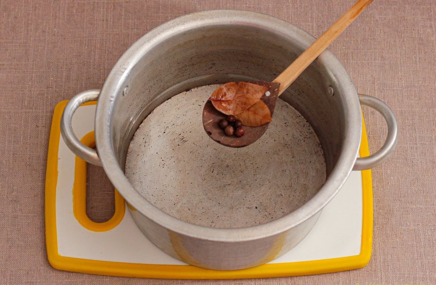 Для варки наливаем пол-литра воды, нагреваем. Кидаем листики лавра, горошины душистого перца. Даем ароматной смеси закипеть и проварим две минуты.