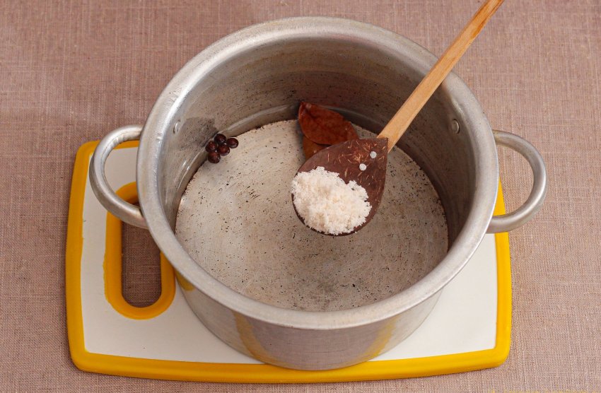 Добавим в воду с пряностями соль, растворим. Снизим огонь до среднего.