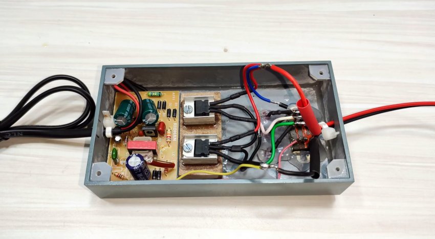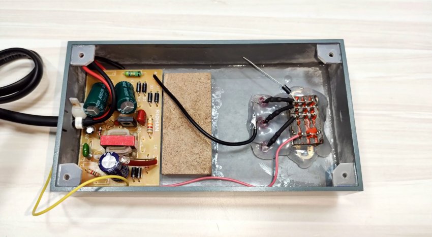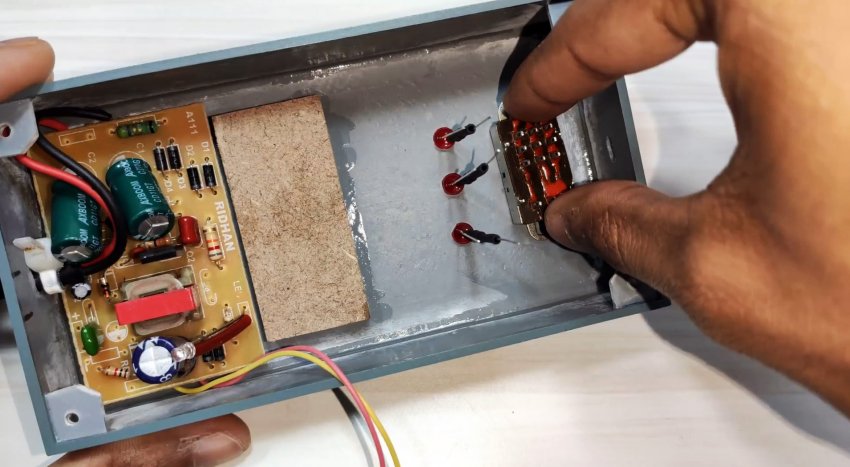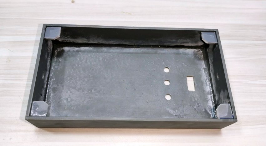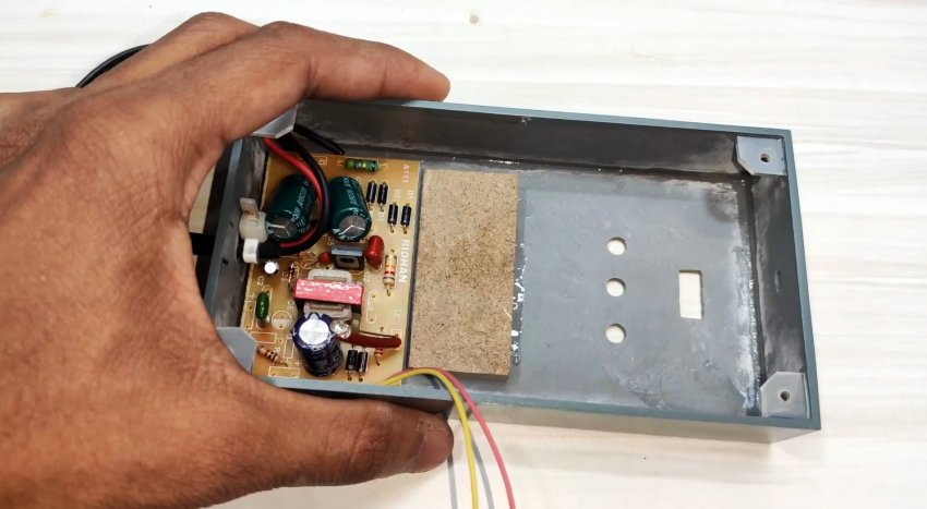 В корпусе сверлятся отверстия под входящие и выходящие провода, светодиоды, переключатель.