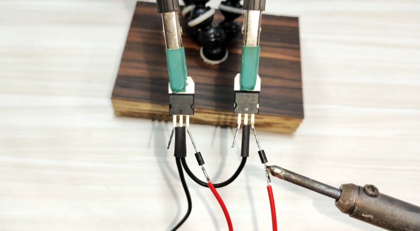 Микросхемы устанавливаем на радиаторы, прикручиваем к площадке. Вывода припаиваем как в схеме.