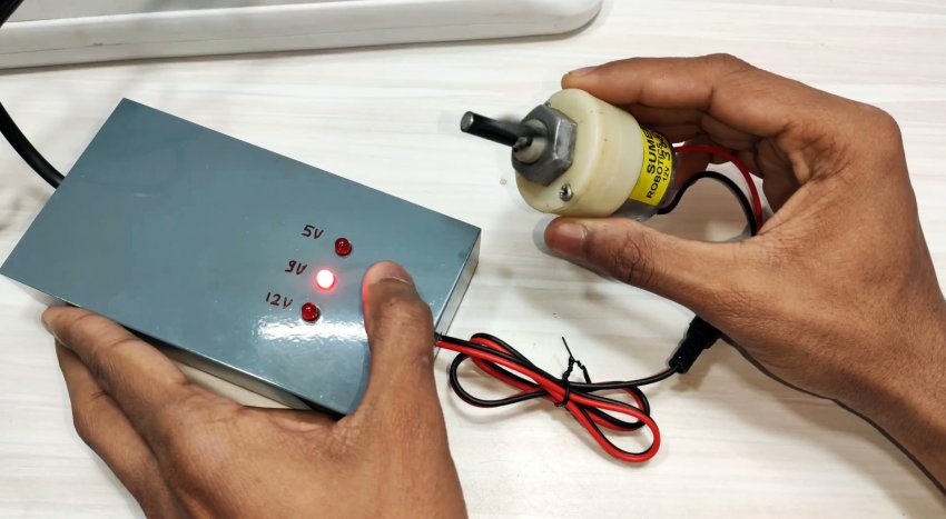Источник готовый выдает 12 В. Если нужно получить 5 или 9, то переключатель пропускает выход через соответствующие микросхемы. Светодиоды сигнализирует о выбранном напряжении.