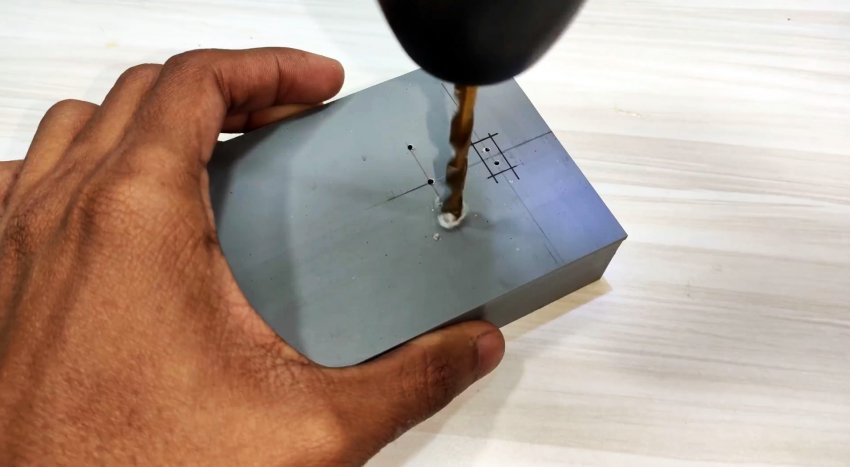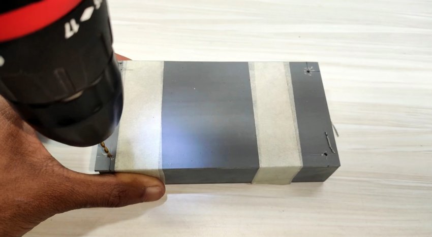 Крышку приматываем малярным скотчем и сверлим отверстия по углам, пронзая саму крышку и ушки.