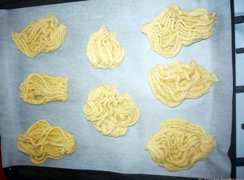11. Формируем печенье и выкладываем на противень, на котором нужно заблаговременно постелить пергаментную бумагу для выпекания.
