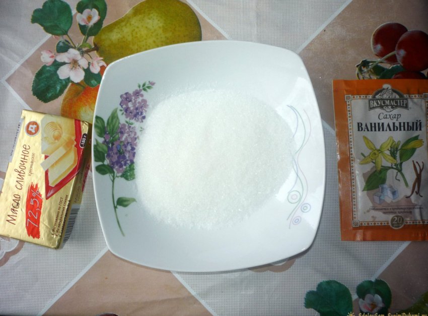 3. Приступаем к соединению сахарного песка, ванильного сахара и масла.