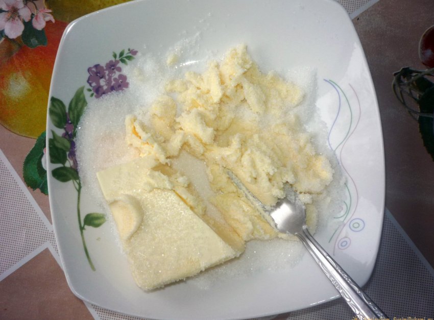 4. Растираем масло с сахаром до однородной консистенции.