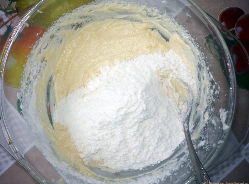 7. Засыпаем ранее подготовленную смесь из муки, соды и соли к взбитой смеси из сахара и яиц.