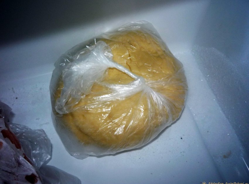 9. Помещаем тесто в целлофановый пакет и кладем его в морозильную камеру на 15 минут, чтобы масло застыло и перестало течь.