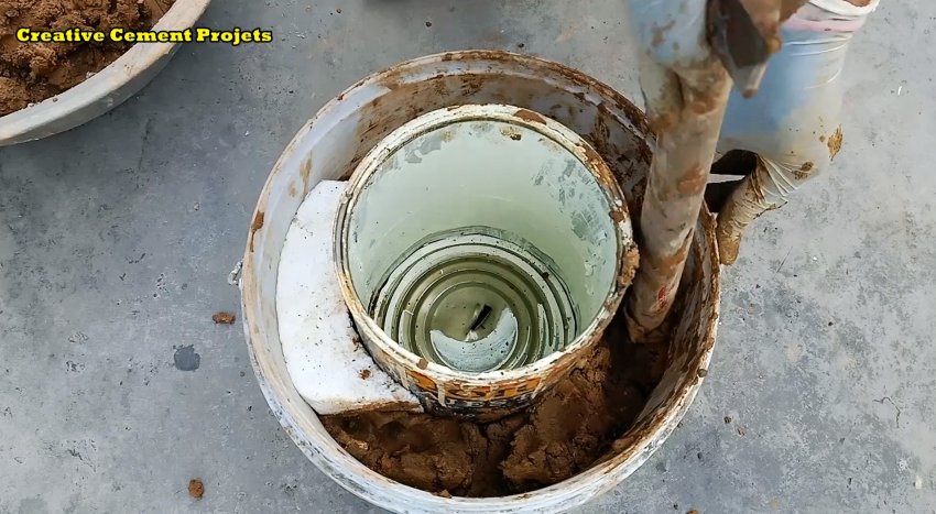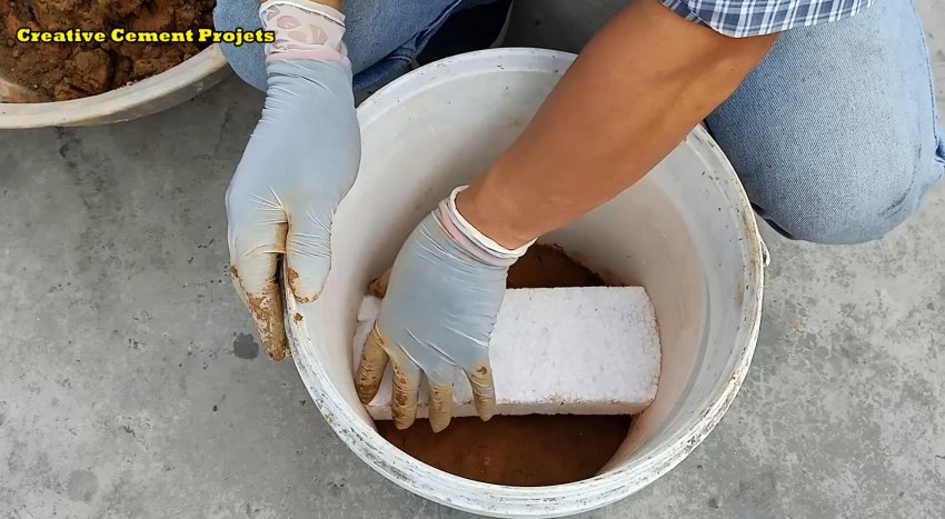 Он накладывается на дно ведра на высоту 50-70 мм. Затем на него ложится пенопластовый блок. Его необходимо заложить раствором с боков.