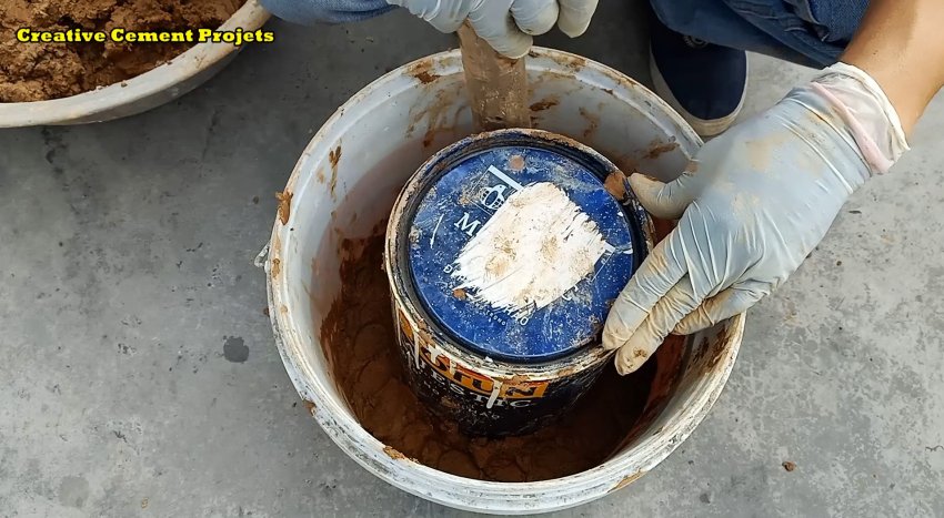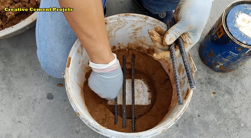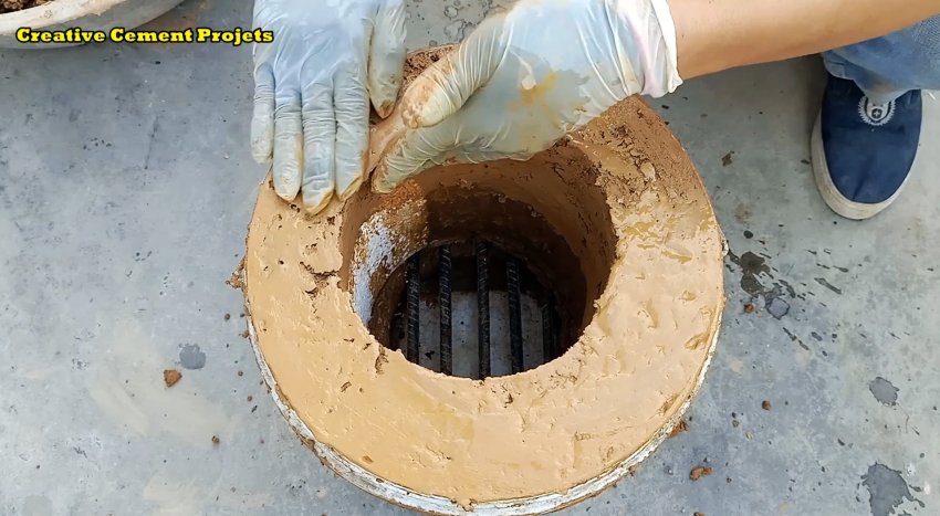В ведро устанавливается жестяная банка и выравнивается по центру. По бокам от нее накладывается раствор, выравнивается и армируется кольцом из проволоки.