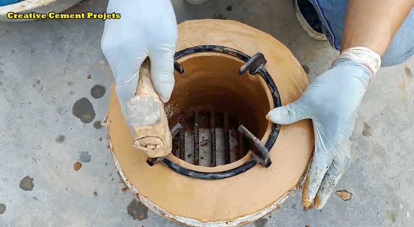 Нужно затрамбовать 50-70 мм раствора, затем убрать банку и выложить колосники из арматуры.
