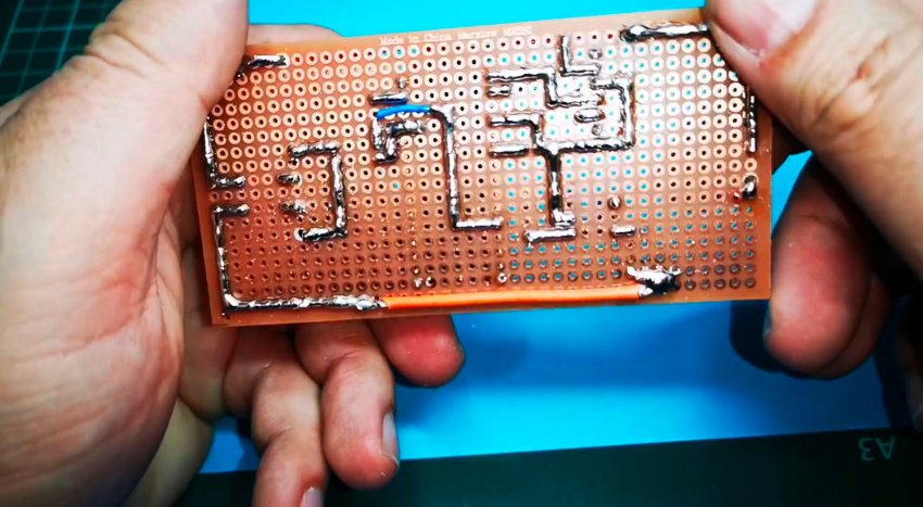 Вид пайки снизу. Длинные проводники выполнены монтажным проводом.