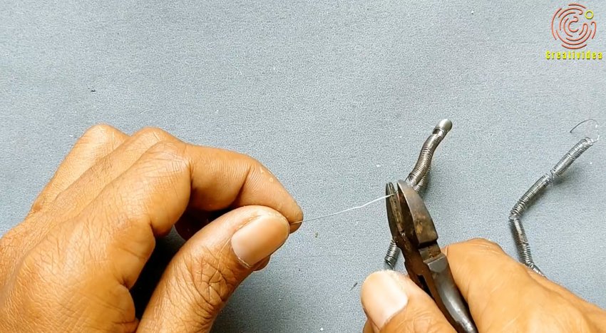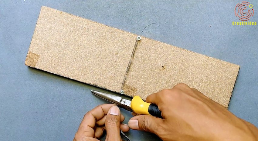 Между саморезами натягивается кусок спирали от фена. Затем по бокам на длинную заготовку прикрепляются короткие.