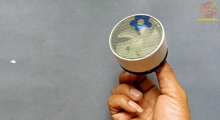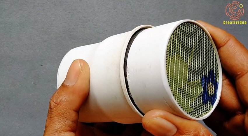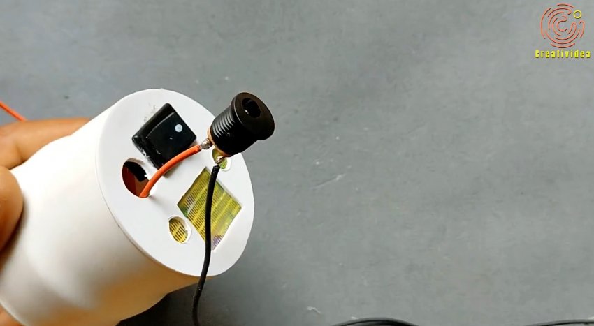 Далее требуется заглушить раструб трубы 50 мм, приклеив вставку из листового пластика. В заглушке прорезаются отверстия под разъем блока питания и выключатель, которые в них вклеиваются после прокладки проводов. Также прорезается вентиляционное отверстие и закрывается сеткой.