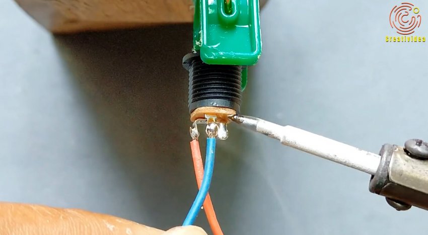 Затем в отрезке пластиковой трубки прорезается отверстие под выключатель. В ее торец вклеивается разъем под блок питания с припаянными проводами. Внутри трубки один из них подводится к выключателю.