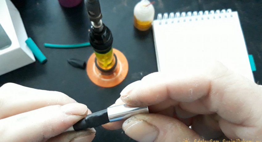 Можно, конечно, подогнать толщину и изолентой, но так оно надёжнее будет. Далее, капаем на получившуюся оплётку пару капель секундного клея, и надеваем приготовленный заранее отрезок трубки.
