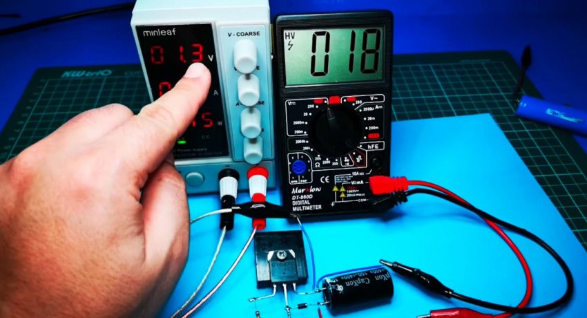 Подаем напряжение 1,3 В. И на выходе уже имеем 18 В.
