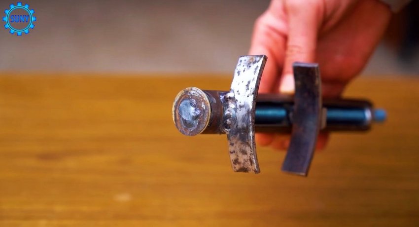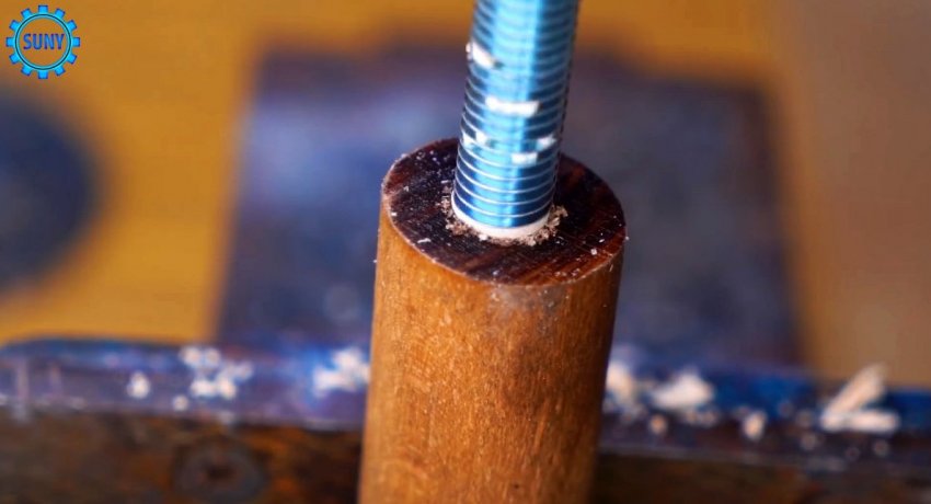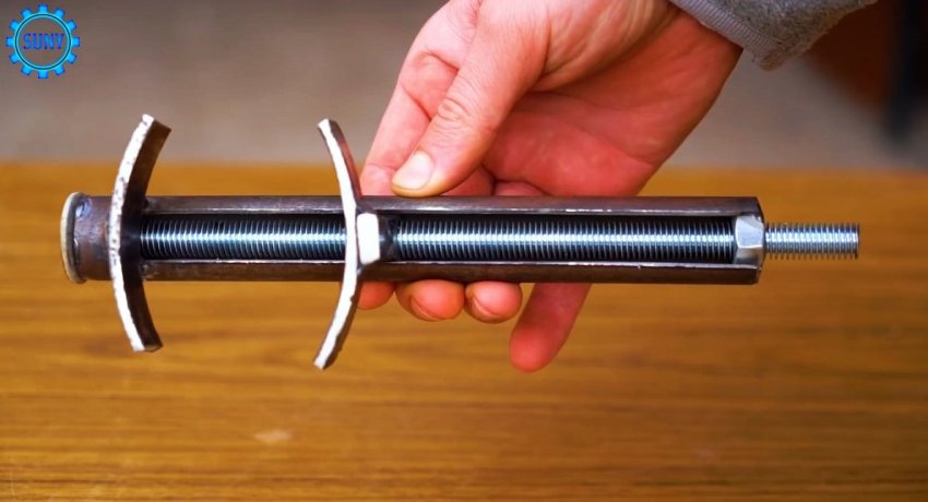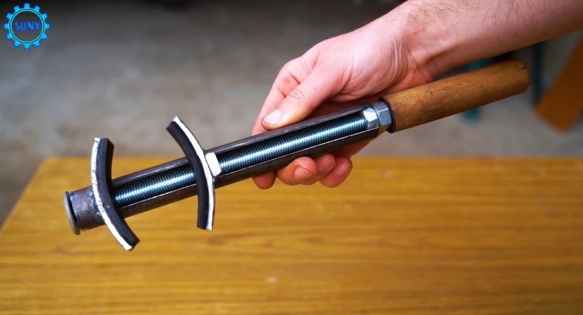 Затем на начало шпильки накручивается ограничительная гайка и деревянная рукоять. На губки инструмента приклеиваются резиновые накладки.