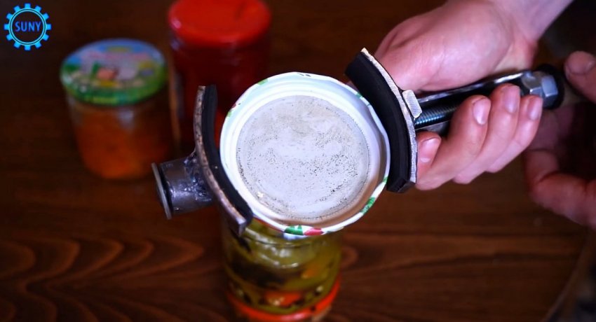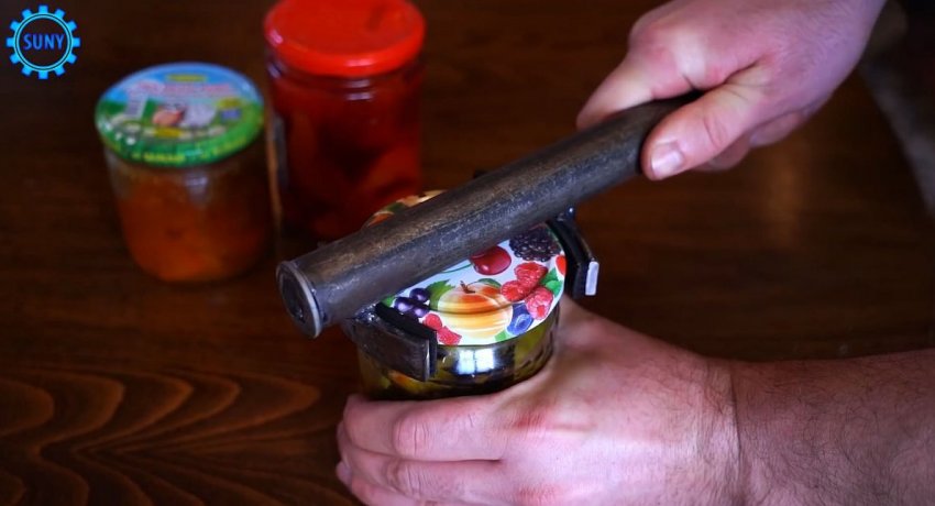 Затем инструмент зажимается на ней, и поворачивается против часовой стрелки. Банку при этом нужно придерживать. Благодаря длинному рычагу крышка откроется без усилий.