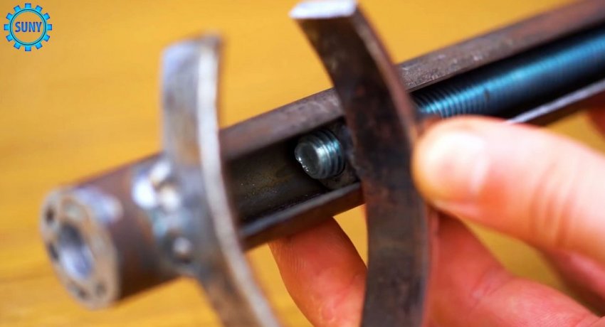Далее вставляется длинная резьбовая шпилька и вкручивается через скользящую гайку.