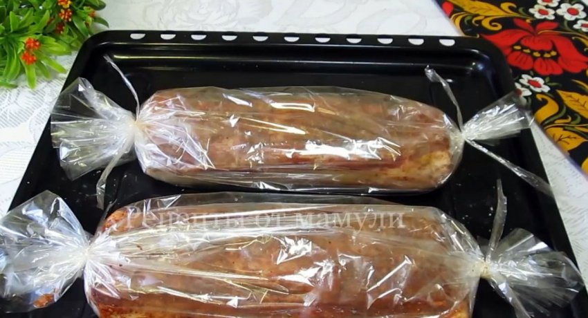 Каждый кусок отдельно укладывается в рукав для запекания и завязывается. Сало выкладывается на противень, и рукав прокалывается сверху в нескольких местах.