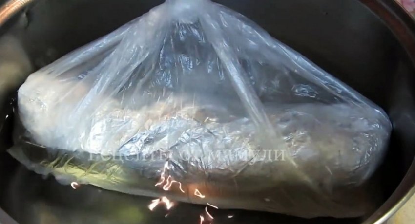 Пакет завязывается и опускается в кастрюлю с холодной водой. Она ставится на плиту и доводится до кипения. Сало варится на слабом огне еще 1,5 часа.