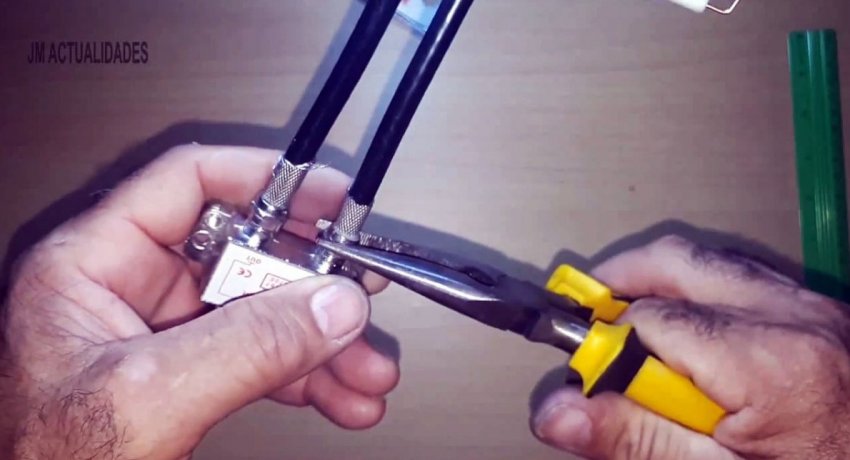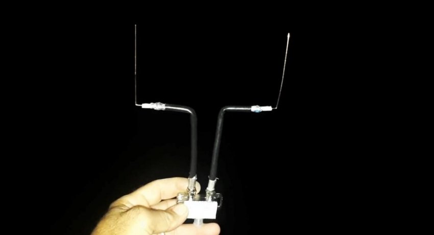 На концы рожек устанавливаются F-разъемы. Затем они прикручиваются на разветвитель. Их нужно развести в стороны так, чтобы расстояние между параллельными медными жилами было 15 см.