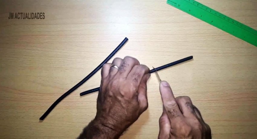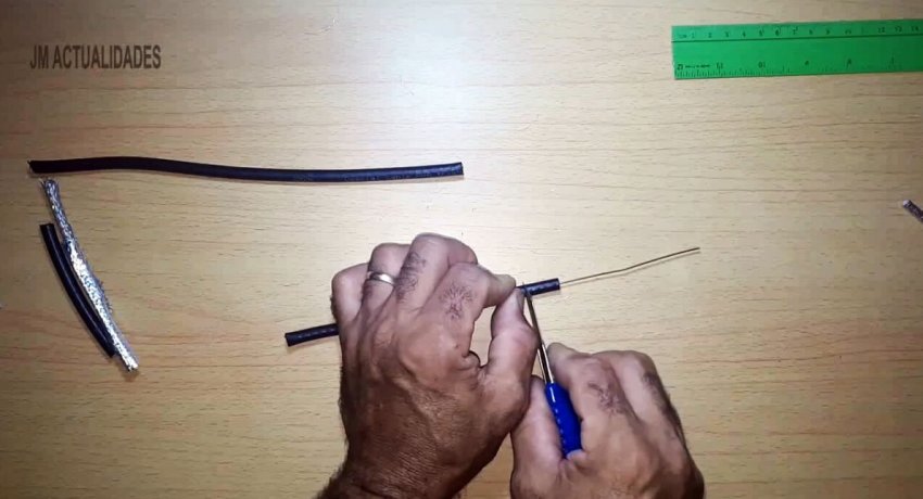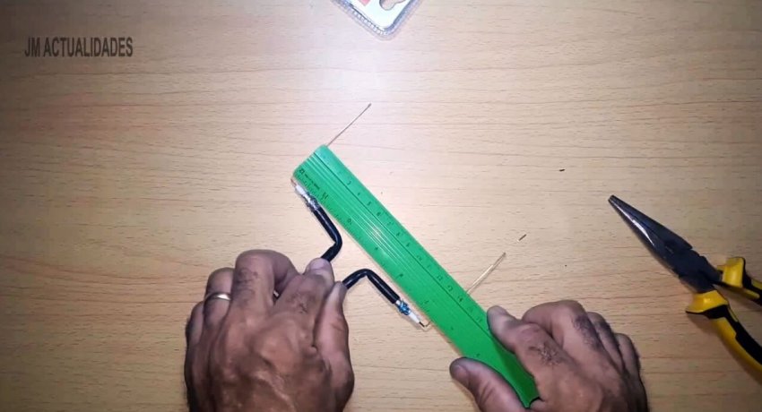Затем на заготовках сгибается оголенная медная жила под прямым углом за 7,5 см от края. Второй изгиб делается уже по изоляции за 6 см от первого.