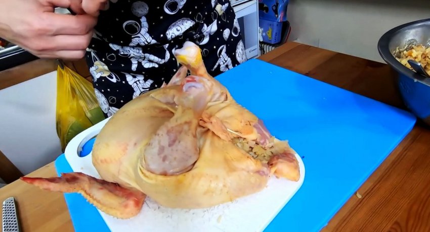 Шпажками или зубочистками необходимо сшить отверстие на шее курицы. Затем в нее накладывается начинка. Ее нужно столько, чтобы курица без костей восстановила форму.