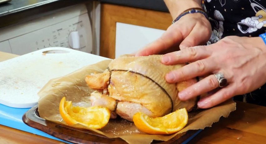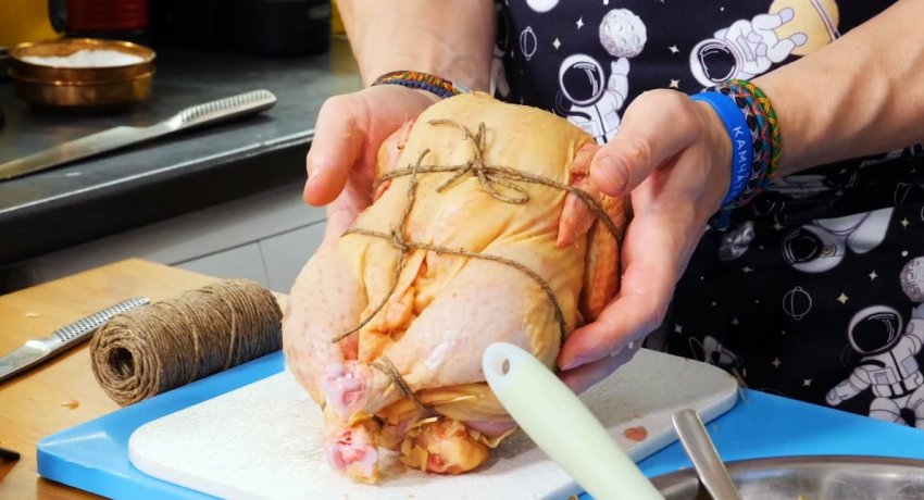 Чтобы курица держала форму, нужно обвязать ее бечевкой. Та подожмет крылья к тушке. Также связываются ножки и подтягиваются к хвостику.
