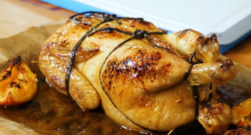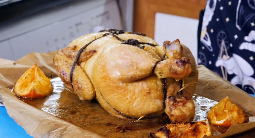 Важно ее не пережечь. После запекания нужно убрать бечевку и шпажки, курица уже будет держать форму и без них. Останется только нарезать ее на порции.