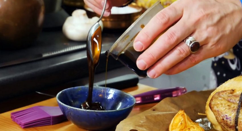 Фольга убирается, и курица смазывается смесью темного каштанового меда и соевого соуса.