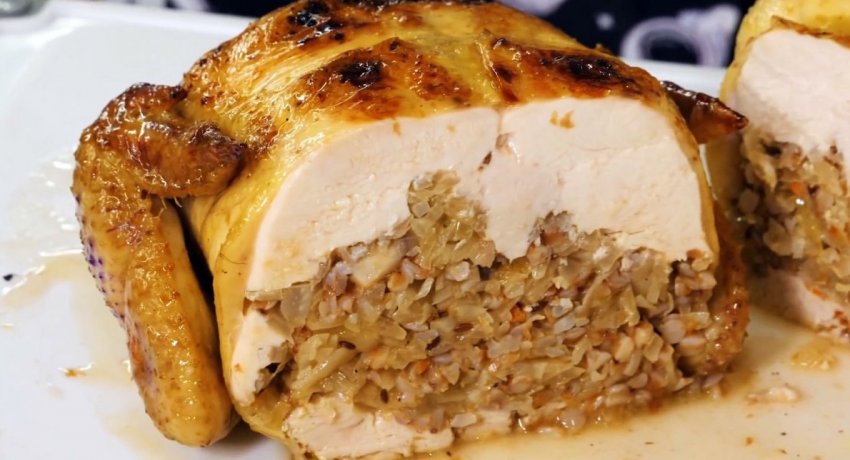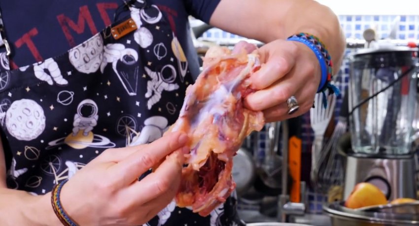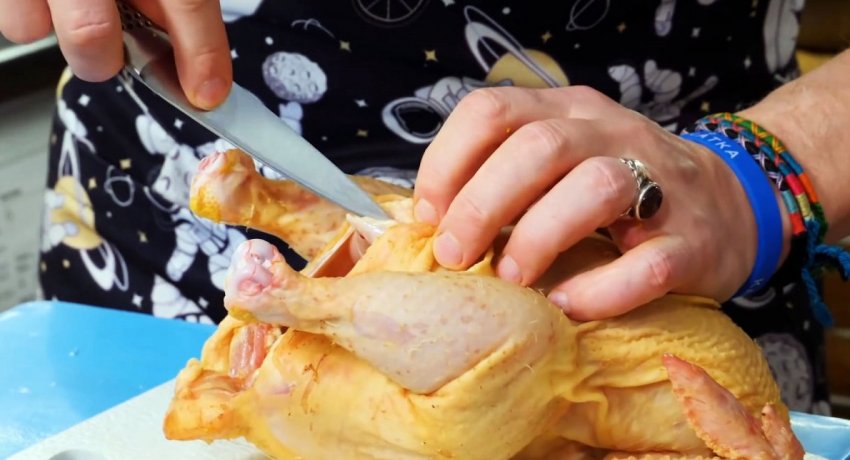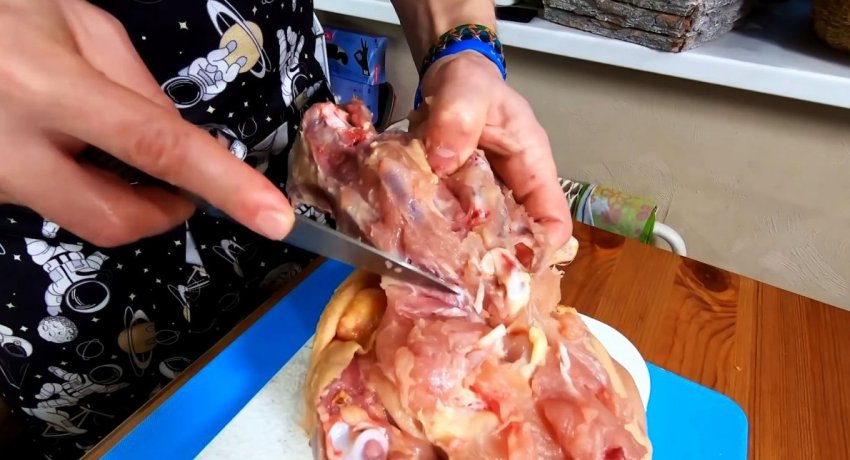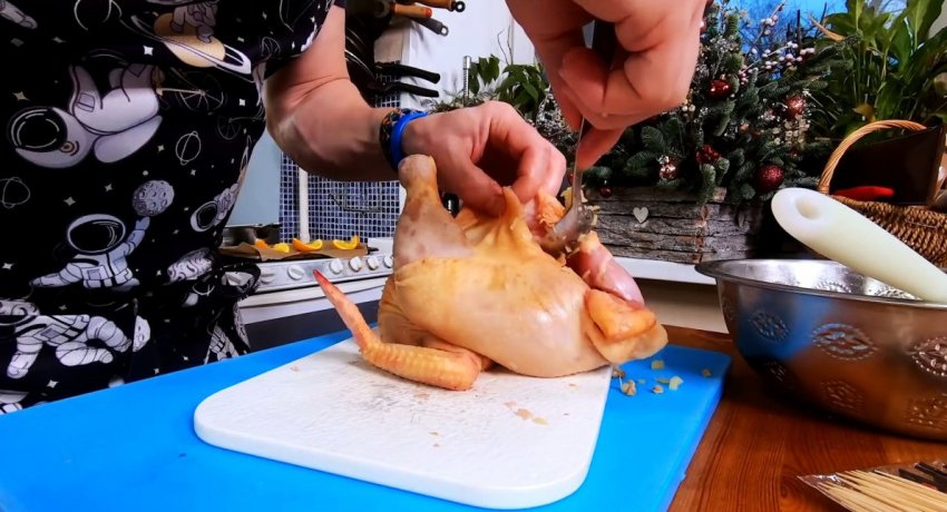 Фишка этого рецепта во вкусной начинке и отсутствии костей в курице. Для этого их нужно вырезать. Кости должны остаться только в крыльях и окорочках. Для разделки нужно взять острый филейный нож и начать им вырезать каркас изнутри со стороны хвоста.