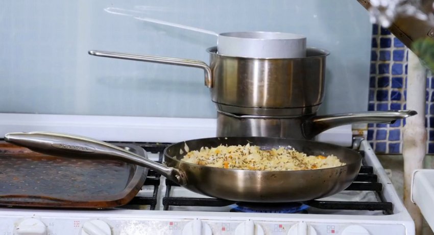 Параллельно нужно вскипятить воду и залить ее в гречку, чтобы та набухла и дошла до полуготовности. Потом она будет смешиваться с тушеными овощами.