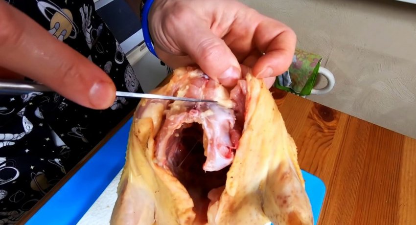 Добравшись до бедренного сустава, нужно будет его отделить, также разрезается и плечо. Шея курицы удаляется вместе с каркасом.