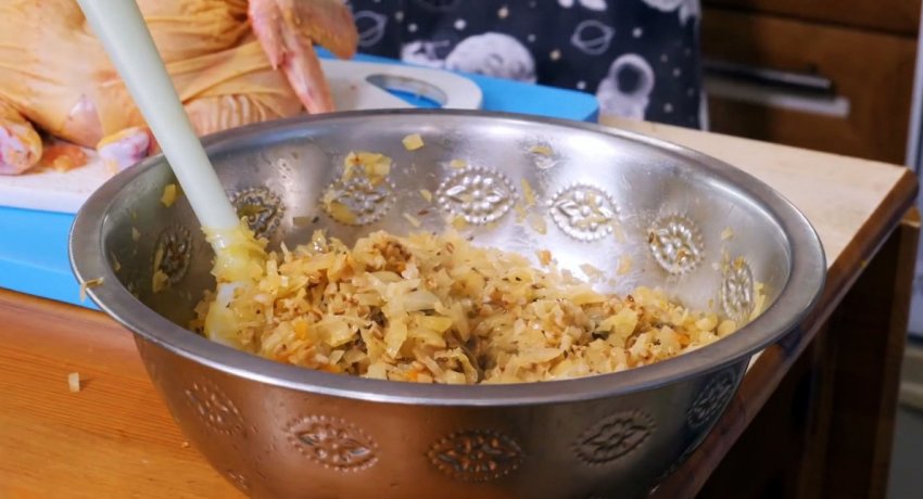 Далее нужно смешать тушеные овощи с гречкой. Начинку следует попробовать. Она должна быть вкусной, тогда и курица получится отличной. В готовую начинку добавляется перец, соль.