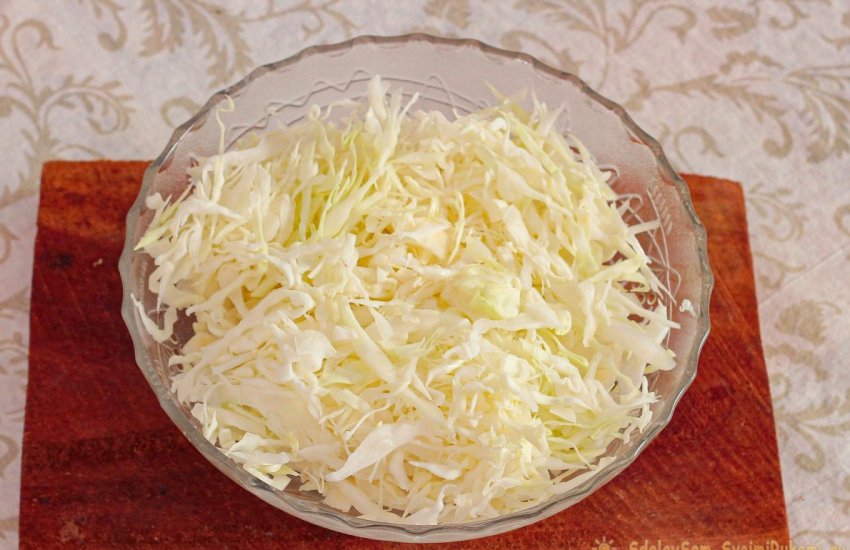 Зеленоватые или поврежденные верхние листья с кочана срезаем, открываем белую чистую мякоть. Натираем через специальную терку-шинковку или шинкуем тонкими полосками при помощи острого тонкого ножа. Капустную нарезку высыпаем в просторную посуду.