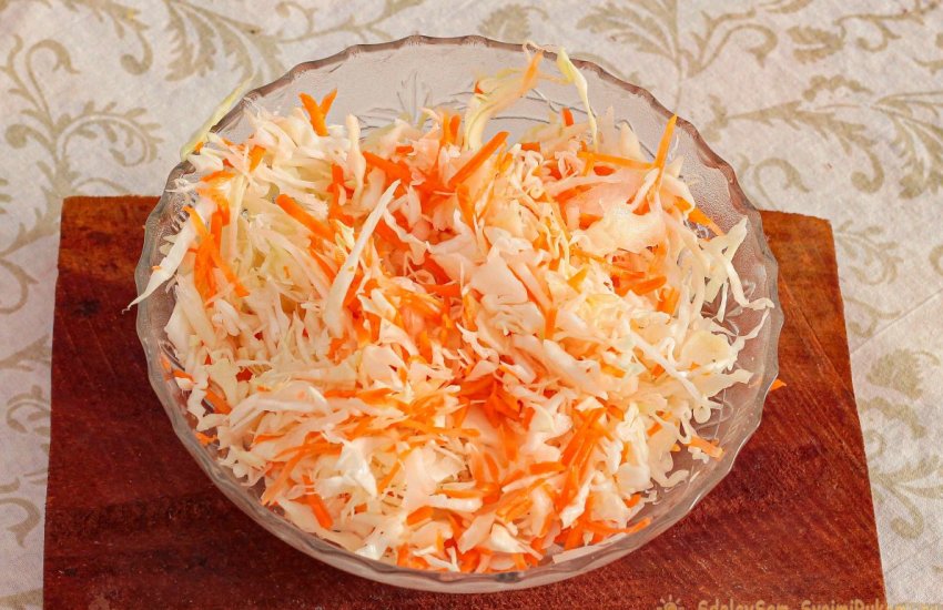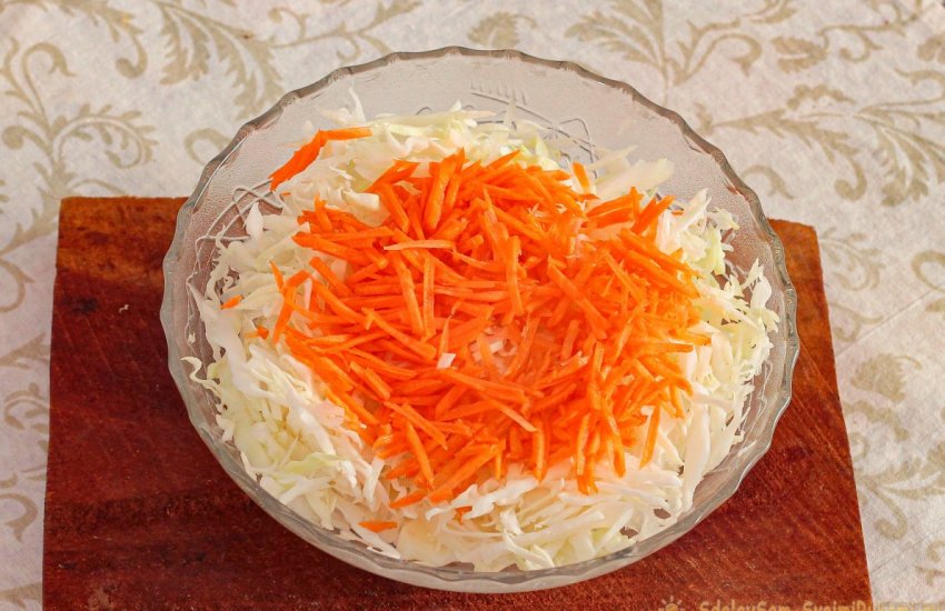 Соединяем капустную нарезку и морковь, слегка разминая руками.