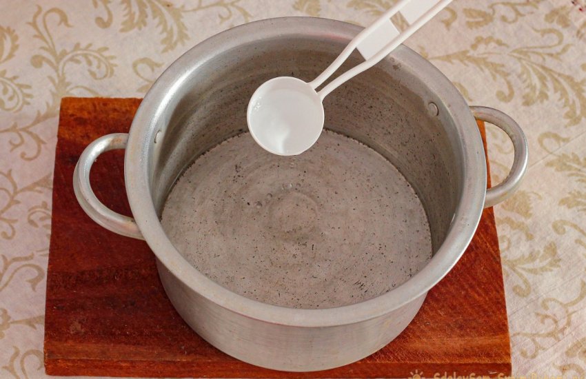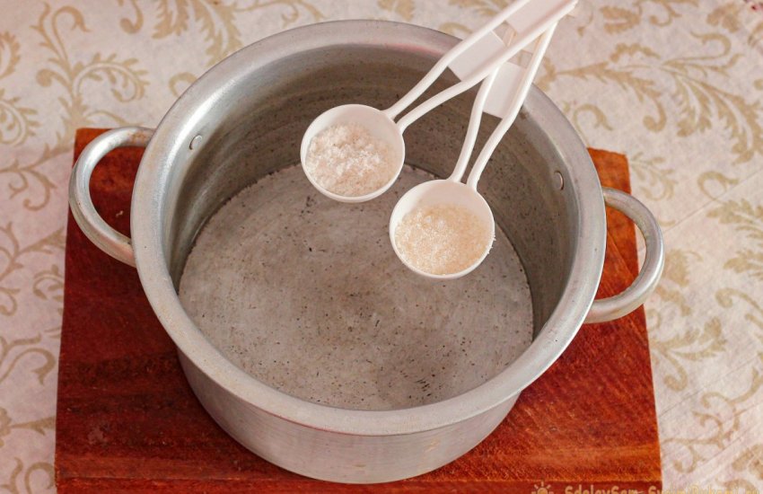 В кастрюлю вливаем воду, подогреваем слегка. Отмеряем столовыми ложками соль и сахар, набираем соль с небольшой горкой, а сахар вровень с краями. Всыпаем в подогретую воду, растворяем.