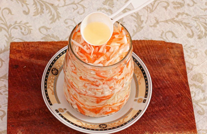 Горлышко банки затягиваем пленкой или укупориваем крышкой и оставляем в таком виде на 7-8 часов в тепле. За это время вкус стабилизируется, в нем не будет доминировать кислота уксуса. Потом маринад сливаем, капусту выкладываем в глубокий салатник. Ей не нужна дополнительная заправка, маринад достаточно маслянистый и насыщенный. Но для аромата можно сдобрить толикой душистого масла и посыпать зеленым лучком.