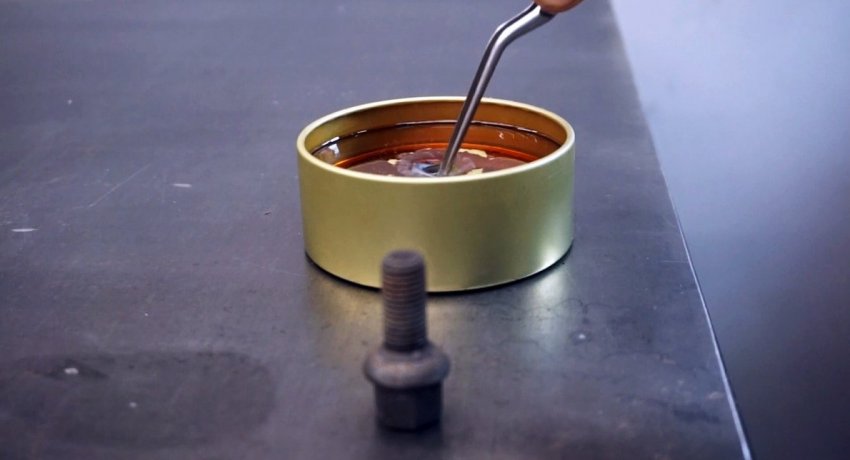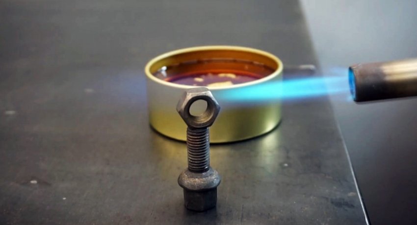 Далее в емкость набирается льняное масло. Изделие для воронения требуется нагреть горелкой и окунуть в ванночку. Греть необходимо до +400°С. Это определяется по серому цвету побежалости. Сначала металл станет фиолетовым, это +300°С, затем серым. Сразу после этого изделие окунается в масло. Нагревать его больше нельзя, так как от этого металл отпустится и станет мягче.