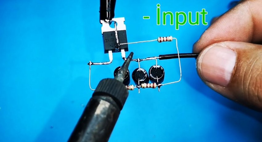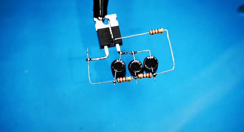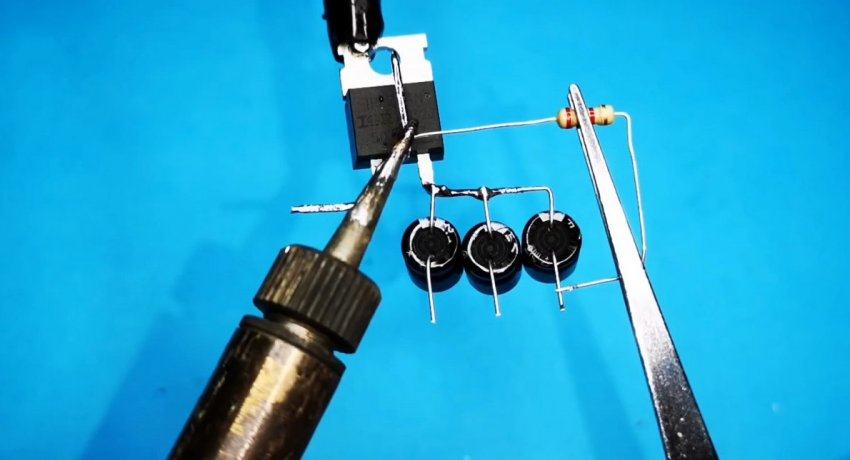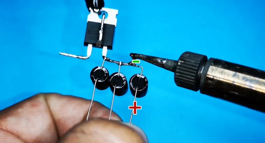 К стоку транзистора припаиваем в ряд конденсаторы минусом.