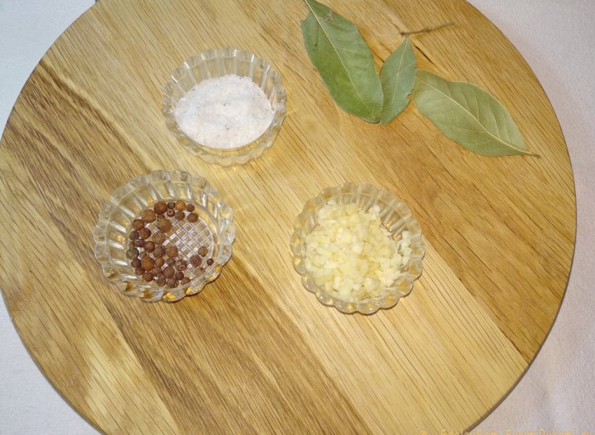 Продукты вновь заливаем чистой водой. Солим по вкусу, добавляем лавровый лист, горький и душистый перец.