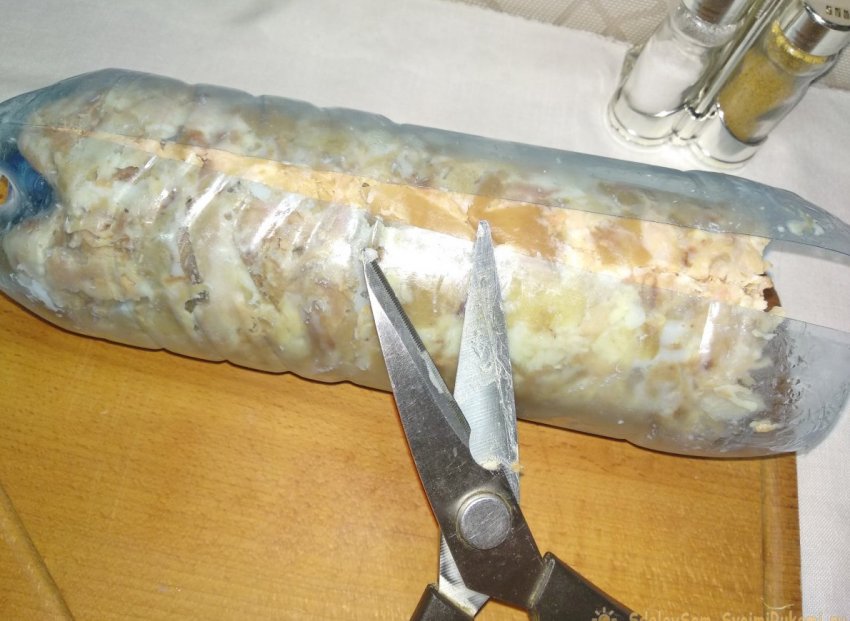 При помощи кухонных ножниц надо разрезать пластиковую бутылку и извлечь готовый зельц.