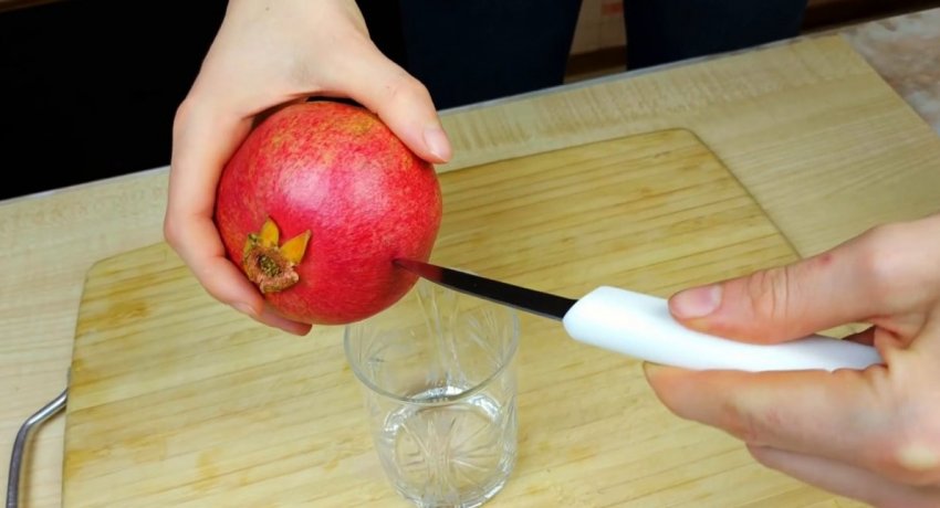 Сбоку граната делается прокол ножом. Будьте аккуратны, он может брызнуть.