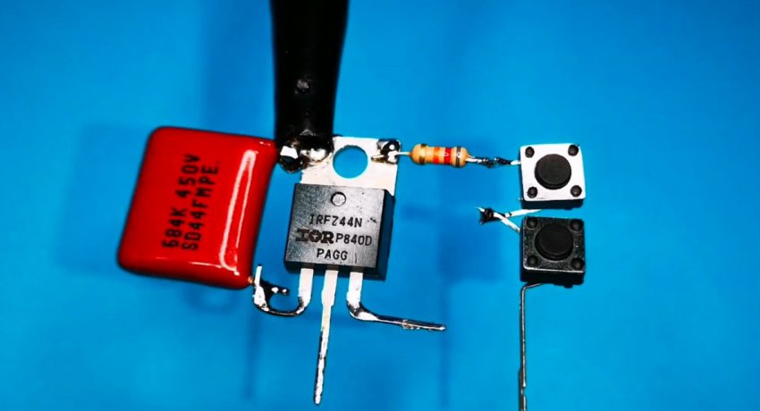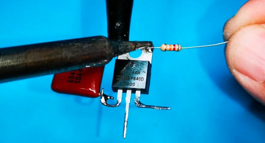 Закрепляем его в «третьей руке». К затвору и истоку припаиваем конденсатор.