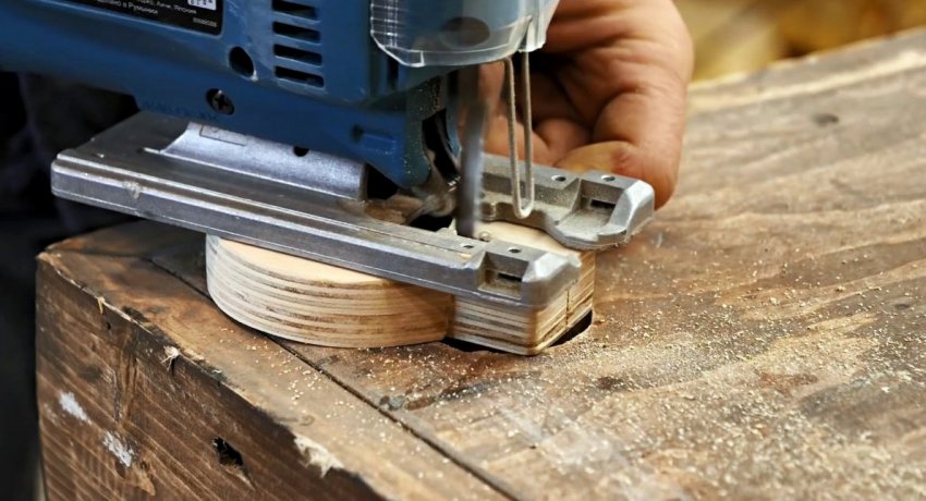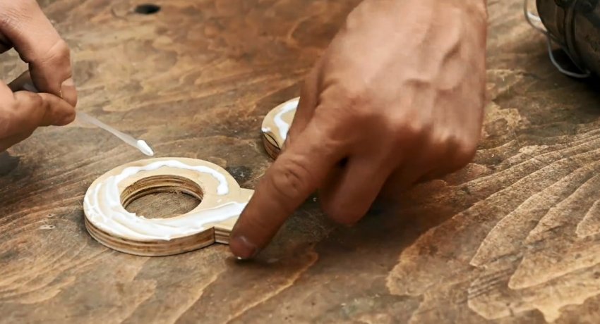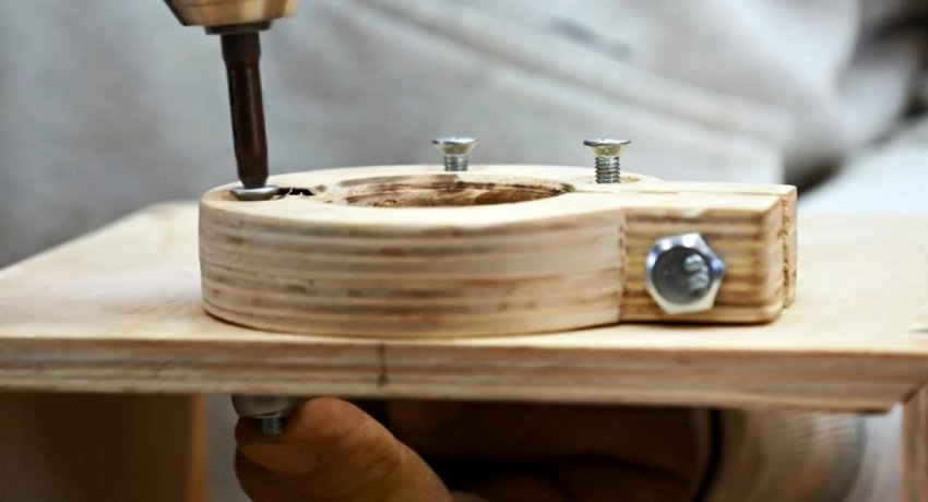 Из фанеры нужно изготовить хомут для крепления насадки. Для этого вырезается 2 детали в виде колец с проушиной.