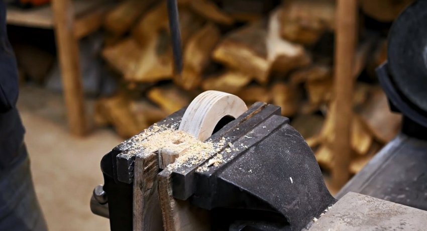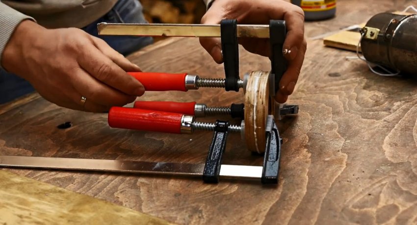 Когда заготовка хомута высохнет, ее нужно отшлифовать. Затем проушина разрезается вдоль внутрь кольца. Сбоку в ней просверливается отверстие, чтобы стягивать ее болтом М6.